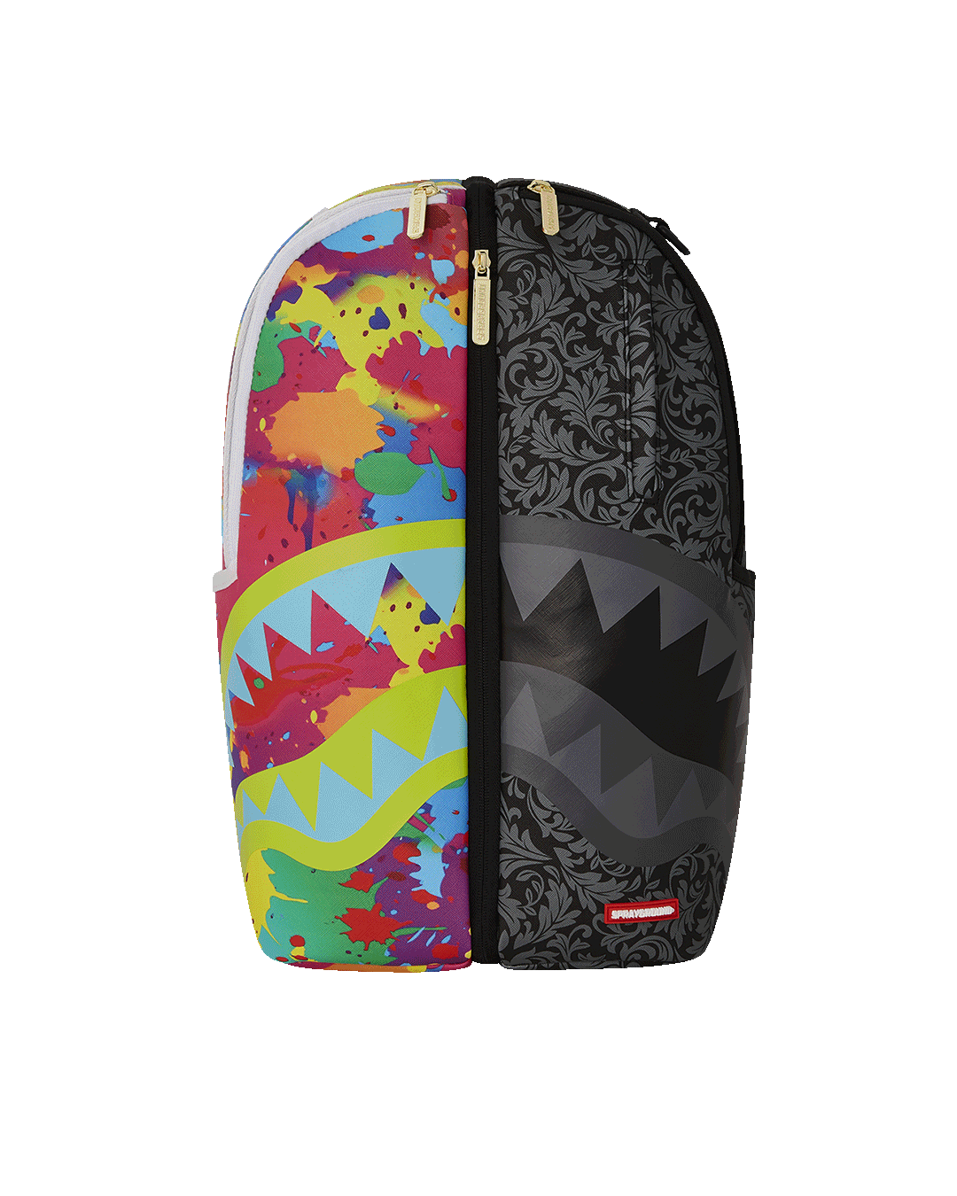 תיק הגב שמתפצל לשניים – חצי שחור קלאסי, חצי צבעוני ובועט – עם רוכסן מרכזי שמאפשר להפריד ולשתף.